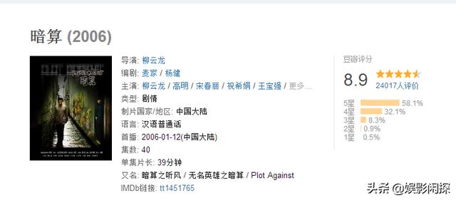 现在在回头看《暗算》在某平台的评分数据,有接近三万人参与,五星评分也有百分之五十八的比例,综合评分8.9分,这依然是一个在国产剧行列中的亮眼数字。现在的柳云龙之所以被称为“谍战剧教父”,这一部《暗算》是出了大力气的。如果不是当年《暗算》取得了相当不错的成绩,也就不会有今天同样优秀的《风筝》了。