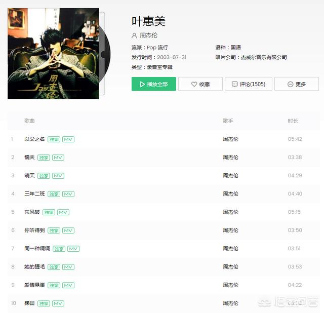 你是电,你是光,你是唯一的神话,这歌熟吗?当年被专辑的另一首东风破压的死死的,成了千年老二,东风破蝉联榜首多少周记不清了,反正挺长时间的。叶惠美经典中的经典,我还是觉得那张JAY最刁。