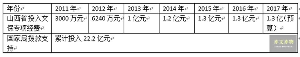 在经济逐年下滑的新常态背景下,五年间,山西省文物保护专项资金由2011年的3000万元,增长至2015年1.3亿元;五年间,山西南部4个地市105处元代之前的古建筑全部得到了维修;五年间,先后实施了215处国保单位、291处省保单位和其他文物的保护工程;第一至第六批国保单位险情100%排除,第七批国保险情排除率达50%以上(总数量为181处);第一至四批省保单位险情排除率达91%(第五批为178处,当时尚未公布)。