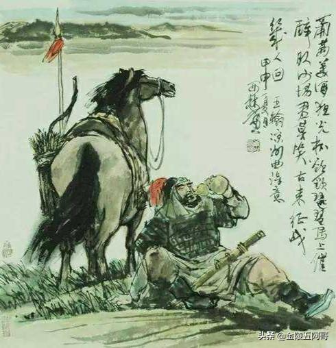 时常想,这样一种边寨饮酒的场景,应该是饮白酒才应景嘛。大口咕下,任凭酒从嘴边涌出。如此,才符合沙场将士的铁血嘛。饮葡萄酿算怎么回事,还是用夜光杯。