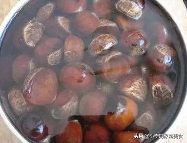 一、先将板栗放入盆中用温水浸泡大约3小时,这一步的目的是软化板栗皮,为下一步的破皮工作做准备;