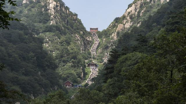 我们简单的拍几张照片以后,继续往上盼盼。最让我难忘的是18盘,那一段路,我觉得自己手脚并行。都要雨天垂直的那种感受,太惊悚,太刺激。终于我们排上了泰山顶。我们在南天门前合影。去天街逛了逛。就准备下山了。