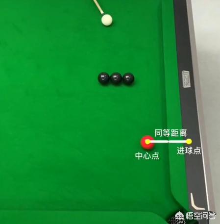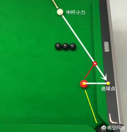 如下图呈现,此时三颗黑球挡住了母球击打红球的直接线路,这个时候我们就要运用“克拉克”了,首先我们将红球的中心点垂直于库边的对称点找到。