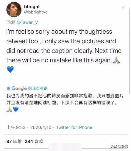 bright刚刚为自己把香港划分为国家道歉:我为我的漫不经心的转发而感到非常抱歉,我只看到图片没有清楚地阅读标题,下次不会再有这样的错误了。