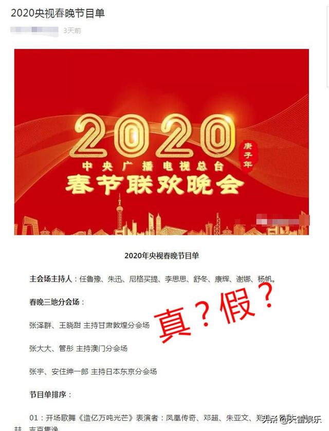 再来看这些分会场,甘肃、澳门、东京——看不出之间任何的规律,仿佛天马行空一般,假的十分离谱。根据惯例,往年分会场的选择,提前至少半年会下发通知到相关地方部门,今年也是如此,有些地方可能出于保密的原因,没有对外公布。但是已经被官方公布的分会场没有出现在网传节目单中,就说明了这个节目单的真实性有多高了。
