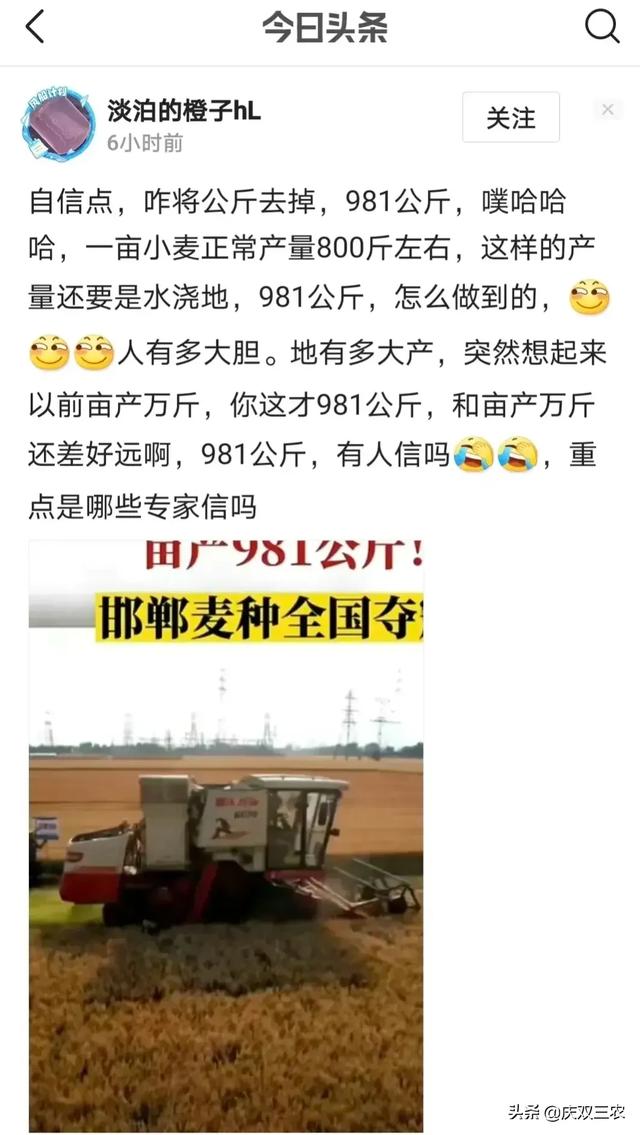 今年小麦产量出奇的高,引起了众多网民的议论。据报道,河北邯郸的小麦,其产量在全国夺冠,亩产量达到了981公斤(1962斤)!