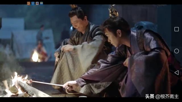 范闲与王启年在黑夜里点着火堆噼里啪啦地烤串,准备吃夜宵: