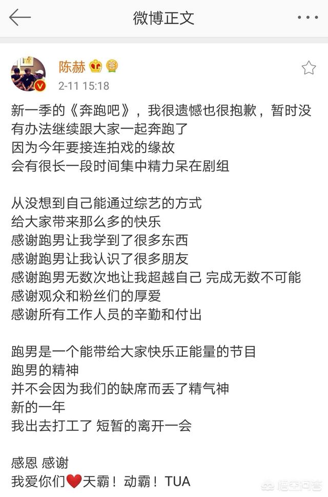 陈赤赤陈赫同样也发表了一篇感谢微博,感谢《奔跑吧》和粉丝观众的喜爱支持。