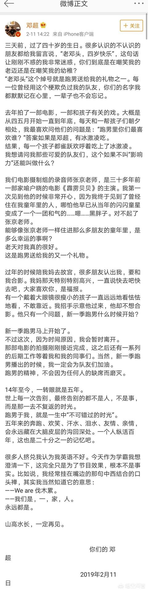 队长邓超发表了一篇长微博,解释离开的原因并发表了时光的感叹。老邓头也四十啦!