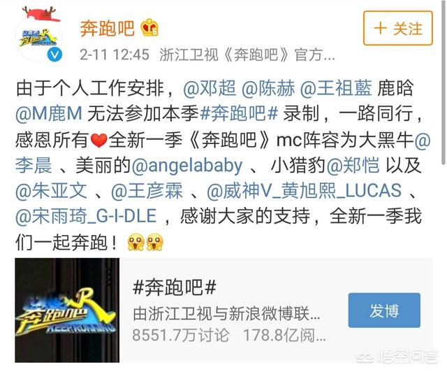 春节假期后第一个工作日,《奔跑吧》官宣MC成员,在微博上激起千层浪!作为从第一季开始追剧的粉丝,一下子换走四个MC,真的是大换血了!个人觉得非常可惜,感觉《奔跑吧》的family可能要散了!