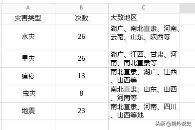 上表只是对天顺元年至成化二十三年的三十年里发生的自然灾害大致做了一个统计。其实还有其他的诸如风沙、冰雹、雷击等各种不同大小的自然灾害。
