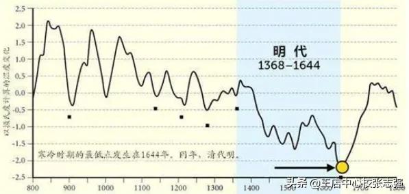如上图,气温的最低点正好处于明朝灭亡时段。整个明朝的平均气温是自西周以来最低的。