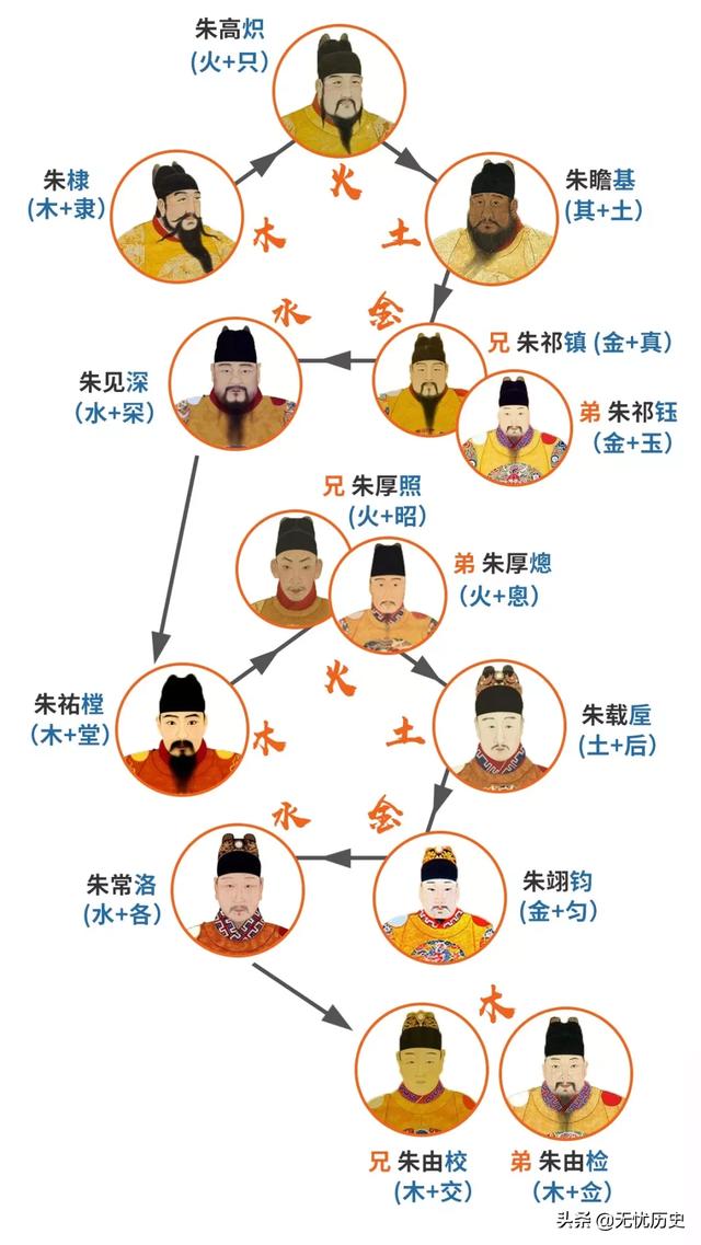 按照朱元璋这个总设计师的规划,所有子孙名字最后一个字的偏旁要按照五行 “木火土金水”循环来取,代表五行相生,生生不息。第二个字为辈分,老朱分别为26个儿子的后代分别制定20字族谱表。比如太子朱标的后代为“允文遵祖训,钦武大君胜,顺道宜逢吉,师良善用晟”,燕王朱棣的后代为“高瞻祁见佑,厚载翊常由,慈和怡伯仲,简靖迪先猷”。