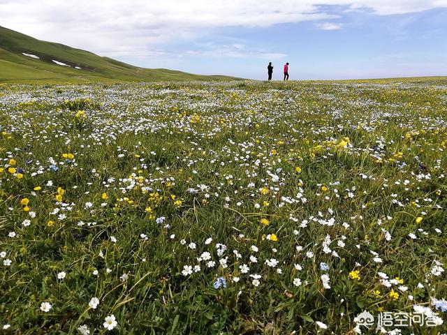 景区面积很大,有280万亩。其中有5000亩为禁牧草场,截止目前已经禁牧5年。雪山下的草原一望无际,这个季节盛开的鲜花有小黄花、满天星、勿忘我、马兰花等。草原如同一张巨大的花地毯铺就在广阔的大地上,百灵鸟在天空的上处,看不到它的身影,却能清楚地听到它的歌声,真是鸟语花香,美不胜收。中午1点半左右,来了一波旅客。见到美丽的景色,大家都非常兴奋,同声高歌《我和我的祖国》、《党啊亲爱的妈妈》等歌曲。声音和鸟声,在草原上空回荡。