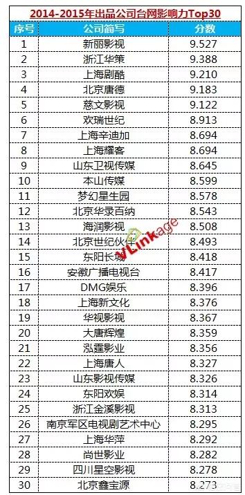 新丽、华策、剧酷、唐德、慈文位居最具网台影响力出品方前五名,这两年来霸屏热剧集《大丈夫》《武媚娘传奇》《花千骨》《何以笙箫默》等均由这5家公司出品,是名副其实的最懂观众需求的出品方。