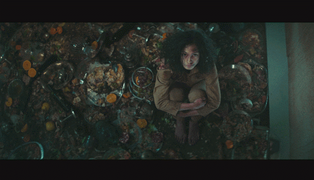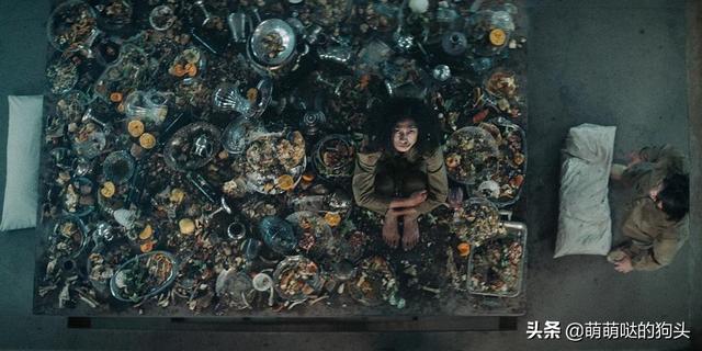 饥饿站台借鉴下一层的设定,每一个下坠的楼层都只能吃到上一层剩下的恶心的食物,揭露了人性的贪婪。其实现实社会就是这样分配资源,所谓的上层人总是拥有着更多的权力、财富、机遇......越往下走,资源当然就越来越少了。人吃人的本质通过着种直白的影片表现手法彰显无疑。
