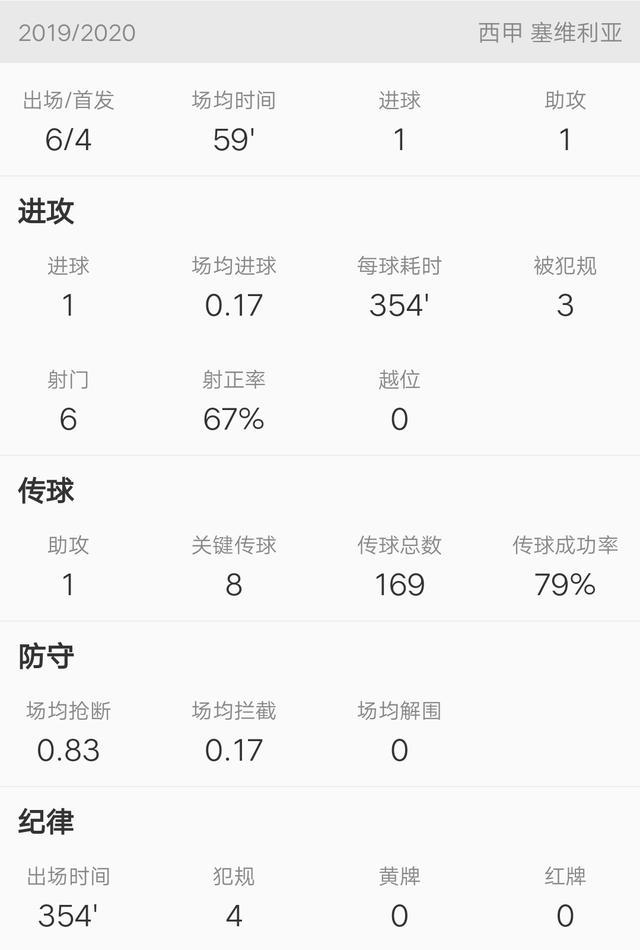 在本赛季,苏索在塞维利亚总共出场8次,首发6次,收获的进球1个,助攻1个。这取得1球1助攻的比赛是对阵西班牙人的比赛,在赛后苏索也取得了当场比赛的mvp。评分也是最高。但在随后的几场比赛中表现平平。