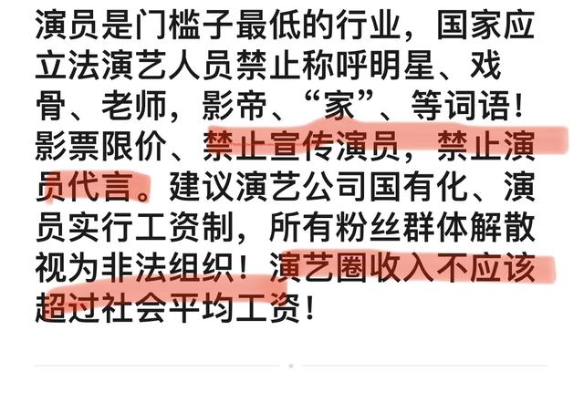 演员是门槛子最低的行业,基本半文盲,演员有很强的可替代性,年收入不应该超30万,影票限价1-5元,禁止宣传演员、禁止演员代言!所有粉丝团体视为非法组织,必须解散!建议影视公司国有化!