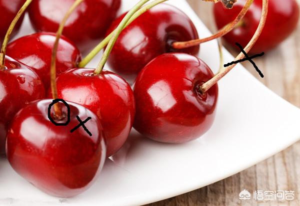 首先看果皮,挑选樱桃时,我们要看看樱桃的果皮,果皮颜色越深代表口感越甜,而且优质樱桃表皮富有光泽、舒展无褶皱、也没有机械损伤和霉斑,而劣质樱桃表皮看起来无光泽、有褶皱,甚至带虫眼,这类樱桃多是存放时间过长,已经严重脱水,也有可能是变质樱桃,不宜选购。