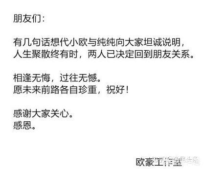 昨日,马思纯和欧豪的工作室发布联合声明,声称二人已经分手,回到了朋友关系,短短的几句话把一年的恩爱全部的清空。