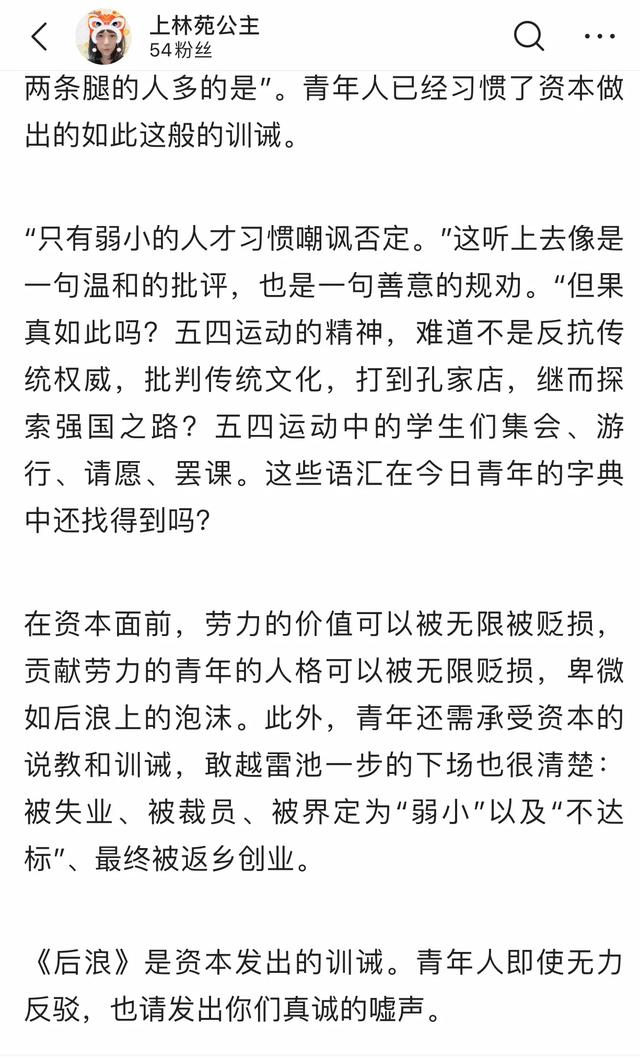所以《后浪》致敬的只有在B站上提供多元生活素材的Up主们(这些人也是从无数个Up主当中好不容易脱颖而出的人,也有的是转身就继承家族千万产业的人),可是却想用“后浪”这个词,指代一代人,这就是问题所在了。