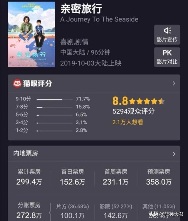 我们先看《亲密旅行》的质量,这部沙溢自导自演的电影,以一个八岁男孩与网约车司机的路上经历为主线展开剧情,其内容中规中矩,且没有票房号召力强的明星加盟,缺乏爆点,也没有槽点,这就让这部电影很快在国庆档里被淹没了。