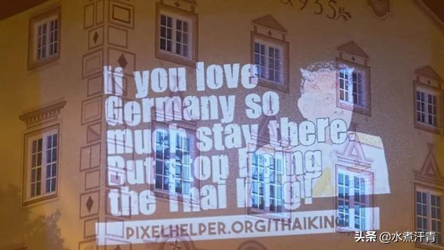 德国民众也对于泰王的行为表示不满,当地时间6月2日晚上,德国抗议人士来到泰王所在的巴伐利亚洲酒店,通过投影仪将抗议标语映射在了墙上: