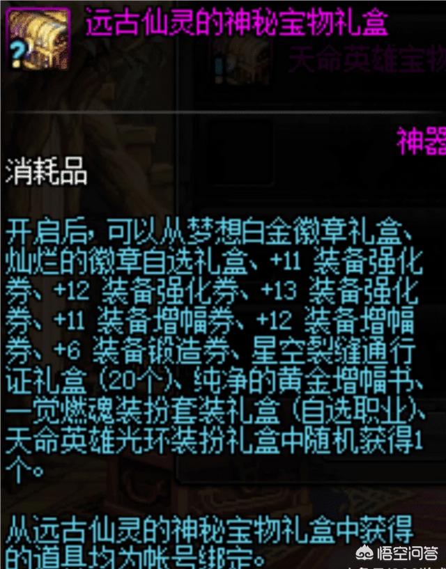 第一选择:赌RP能出 12增幅卷如果你觉得自己RP好,可以选择远古仙灵的神秘宝物礼盒,这个礼盒开出来的东西都是随机的,里面有各种极品道具,神秘强13卷啊,增幅12卷啊,还有一整套的燃魂套装啊,还有梦想白金等等等。不过~当你去开的时候,你会发现,全TM的是星空裂缝通行证~
