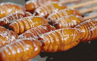 知名度最高莫过于烤蚕蛹。那些蚕蛹被活活串成了糖葫芦,在炭火上极力扭动,直到被烤得焦黄酥脆。