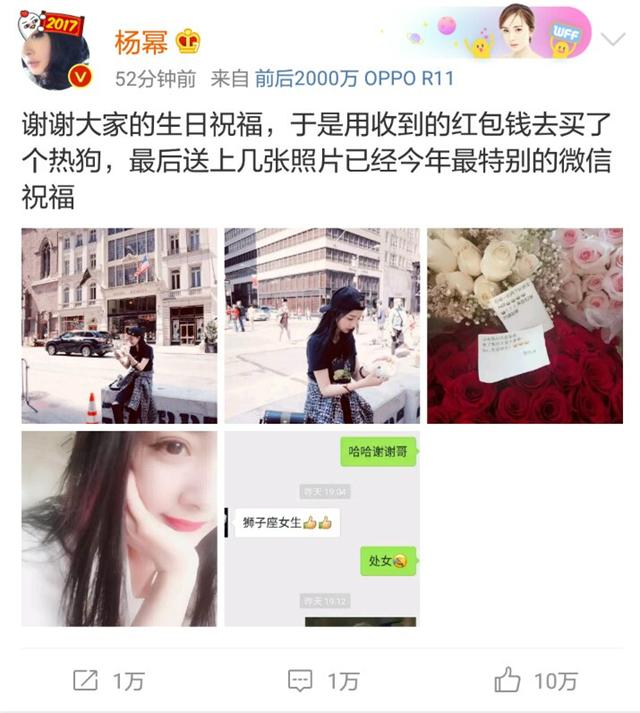晚上,幂幂在微博感谢大家:“谢谢大家的生日祝福,于是用收到的红包钱去买了个热狗,最后送上几张照片已经今年最特别的微信祝福。”