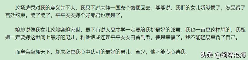 所以,甄嬛虽然是待选秀女,且品貌拔尖,依然希望自己落选。然而结果未能如她所愿,还是进宫当了皇帝的妃子。