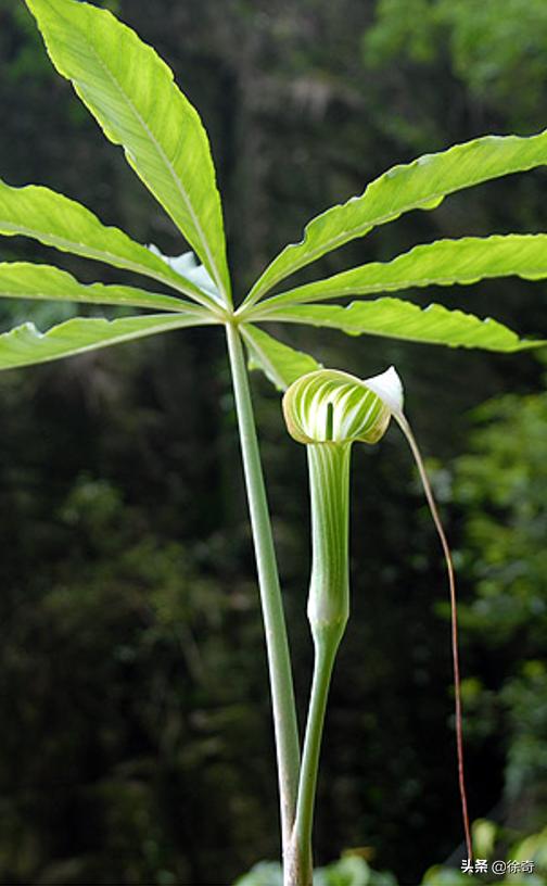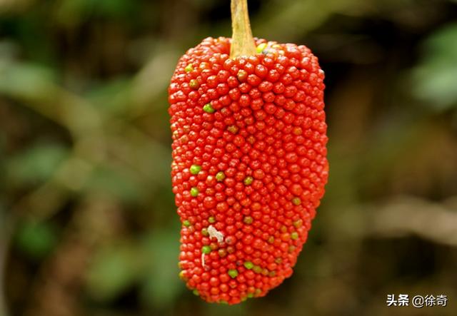 像这样的一个立着的半包着的绿色苞片里面藏着一根柱子,外面还连着细长的须须,叶子多像手掌一样的植物千万不可动,虽然它的果实是那么诱人,但越诱人不是越可能有毒么