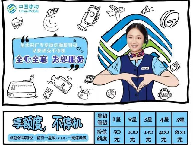 据悉,某地区的中国移动推出享额度、不停机服务。根据用户的星级给出不同的欠费授权额度。
