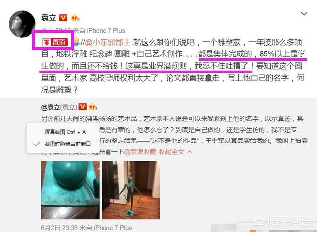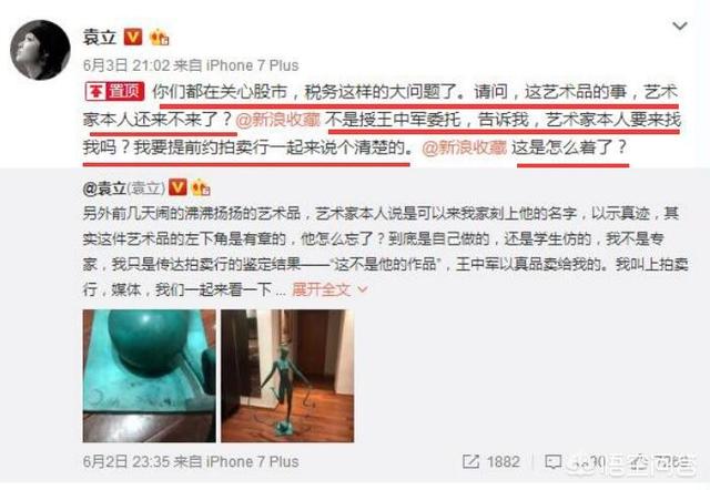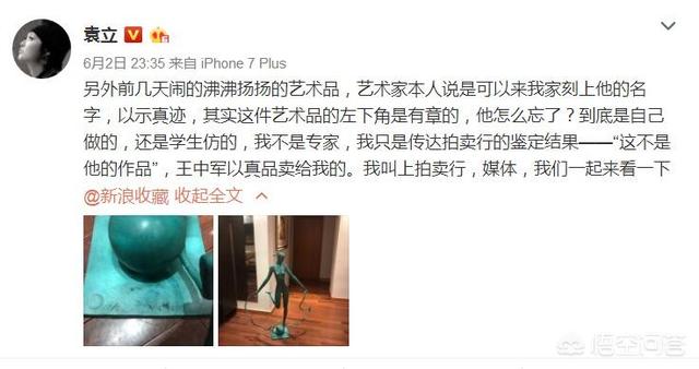 那么我们就来看看,到底孰是孰非?袁立的这尊雕塑,到底是不是假的?为什么王中军,与魏小明不再回复了?要想知道真相,也不太难。首先看看袁立的依据是什么?她最主要的依据来自两个方面,第一方面是她说:雕塑是假的,是因为拍卖行鉴定过。另一个方面来自,网络流言飞语。所以她最大的质疑是:作品是魏小明?还是学生的仿的?在她微博中大量的充斥着雕塑品“内幕”的说法。那么袁立就以其中一篇为准,来质疑别人,实在荒唐。看下图。