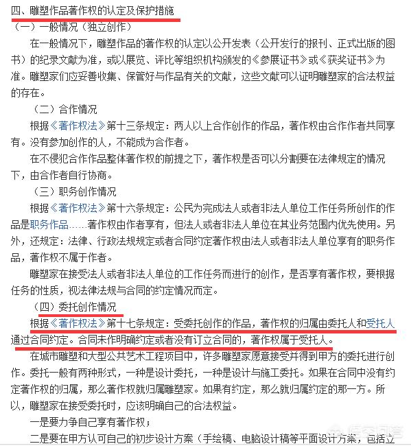 我国《著作权法》第十七条规定:受委托创作的作品,著作权的归属由委托人和受委托人通过合同约定。合同未作明确约定或没有合同,著作权属于受托人。我来解释一下:《著作权法》规定,就是说即使是完全像袁立所说的,是学生完成的。在法律上只要有合约也完全属于魏小明的作品。由于雕塑品,不同于其他文物。例如:大型地标,其中有建筑学,有铁焊技术等等这些一般都是其他人完成,但创意,色彩,寓意等都有是作者的,所以署名:必须是作者原创。