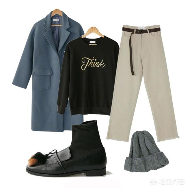 雾霾蓝大衣配黑色,一件黑色针织衫,再搭配一条黑色小脚裤或黑裙子 ,优雅、大气又显气质。
