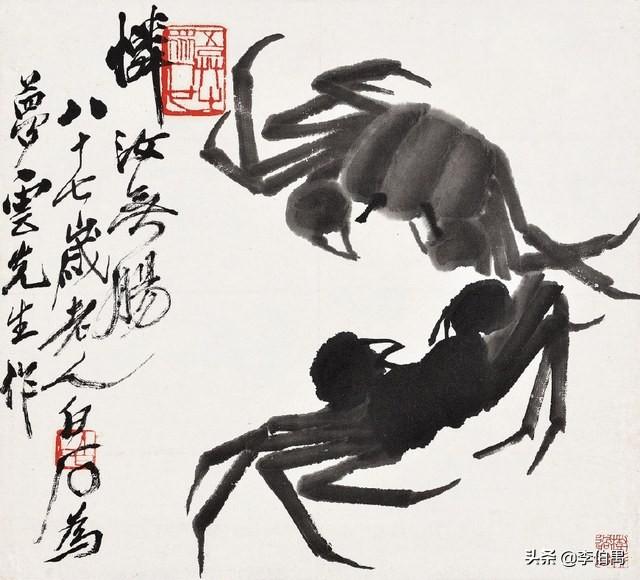 白石老人曾认真学习历代画家的技法,尤其徐谓,八大山人等的画法对他后来的风格有较大影响。但并没有突破进展。后来齐白石与陈师曾大画家相交,在绘画方面受到陈师曾的指点和启发,他决心要突破传统画法和体裁的束缚,摸索走自己的路,便闭门十年,研究新的画法,这十年被称为”衰年变法”,大约也就是他57岁到67岁之间。当时中国画坛的画风非常守旧,以临摹古人为主。齐白石的变法,打破了这种跪拜在古人脚下的风气,创造出了属于自己的风格,改变了体裁,创出了用色和水墨强烈对比的风格。如鲜艳的荷花和大片饱满的水墨黑色荷叶的相映成趣;又创造了工笔和大写意的画面结合,如在泼墨似的树汁上立行走着一支精工细画的蝉,等等,独出新裁,他把农间的萝卜、瓜豆,葫芦,小青蛙,虾,螃蟹,猪,老鼠,等等,都搬到了画纸上去,成为自己常画的内容。