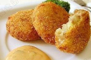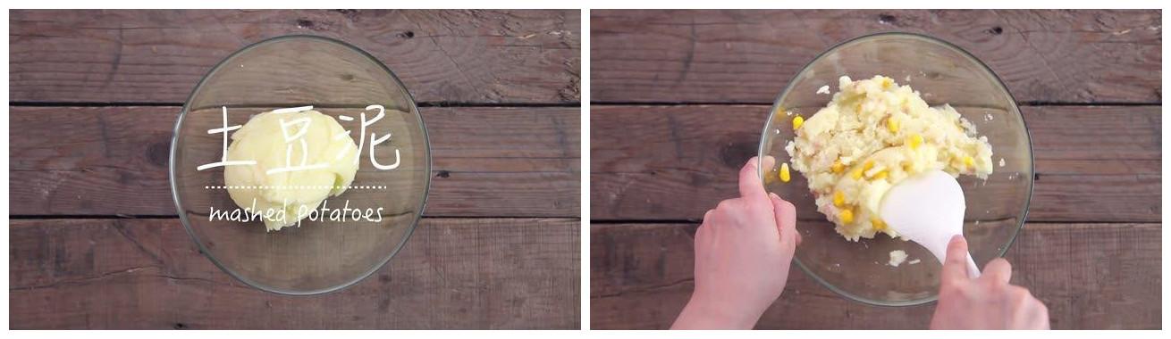 1.自行把土豆变成土豆泥,然后加入煸炒过的玉米粒、火腿丁、洋葱丁和适量的盐和胡椒