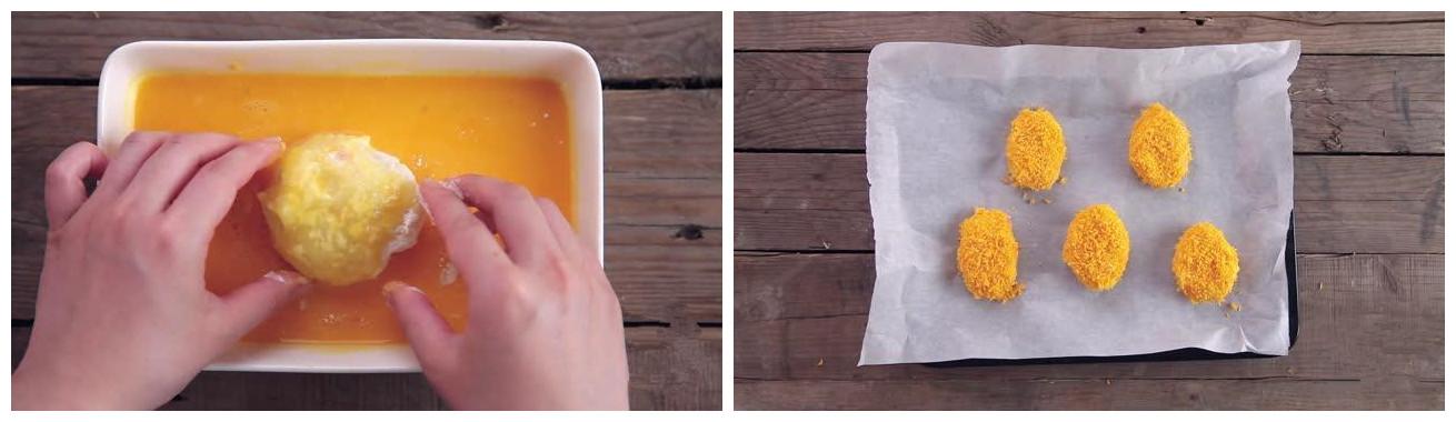 3.然后将过完面粉的土豆团过一遍鸡蛋然后均匀裹上面包糠
