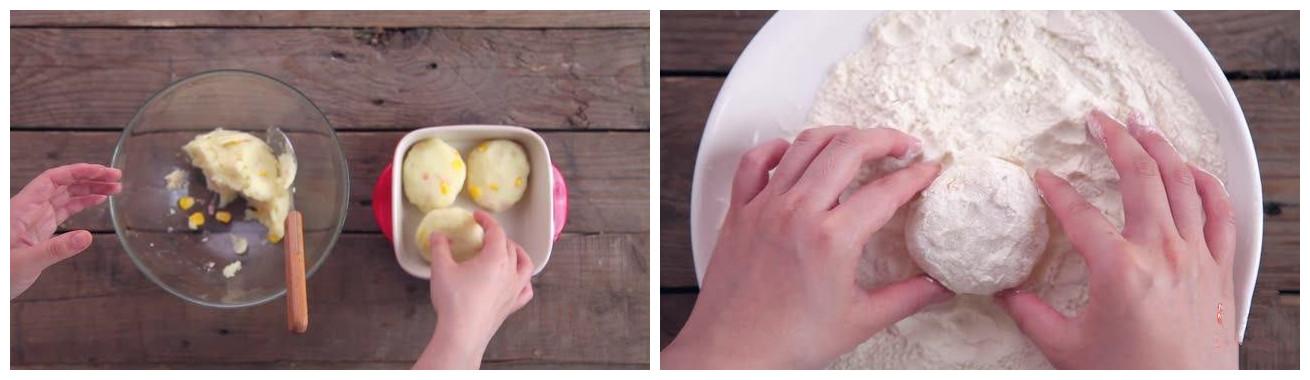 2.将土豆混合物,用手捏成团状,过一遍面粉
